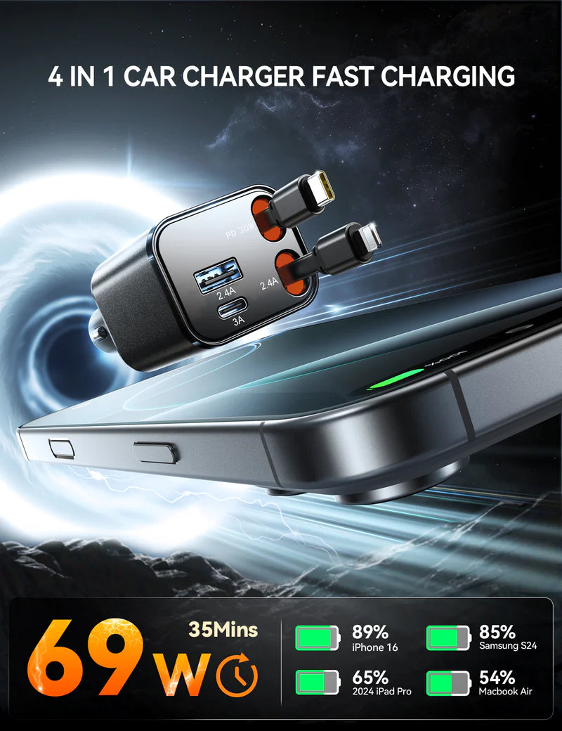 Lleva la comodidad y velocidad al siguiente nivel con el Cargador de Auto Retráctil Joyroom CCL05 4 en 1, la solución definitiva para mantener todos tus dispositivos cargados mientras viajas. Su diseño ultra-compacto 2025 combina tecnología avanzada de carga rápida con un sistema retráctil inteligente que elimina el desorden de cables en tu vehículo.