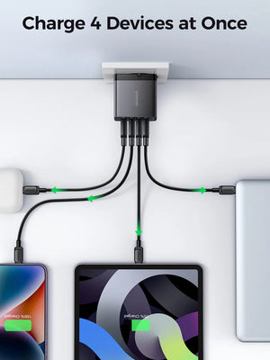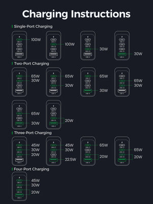 - Salida total: Hasta 100W, permite cargar hasta 4 dispositivos simultáneamente.